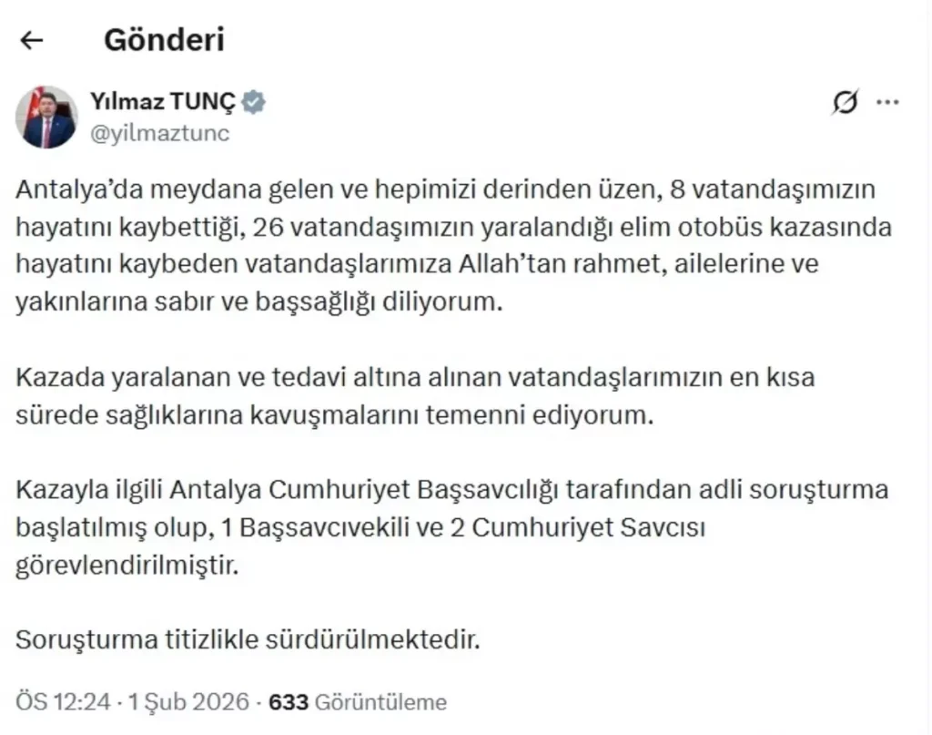 Министр юстиции Йылмаз Тунч в своем заявлении на социальной сети сообщил, что начато расследование автобусной аварии в Анталье. Министр Тунч сказал: «В Анталье произошла трагическая автобусная авария, которая глубоко потрясла нас всех, в результате которой погибли 8 наших граждан и 26 получили ранения. Я выражаю соболезнования семьям и близким погибших, желаю терпения и скорейшего выздоровления нашим гражданам, получившим ранения и находящимся на лечении. Прокуратура Антальи начала судебное расследование, назначены 1 заместитель главного прокурора и 2 прокурора. Расследование ведется тщательно», — отметил он.