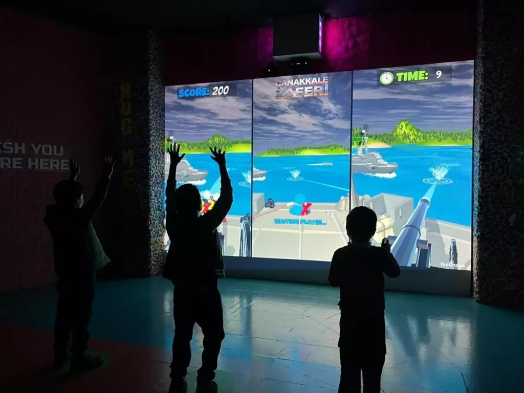 Дети, перенесенные на сцену с помощью зеркального эффекта, могли увидеть себя в роли солдат на войне перед проекционными экранами и испытать историческую борьбу в играх, посвященных обороне пролива Чанаккале.