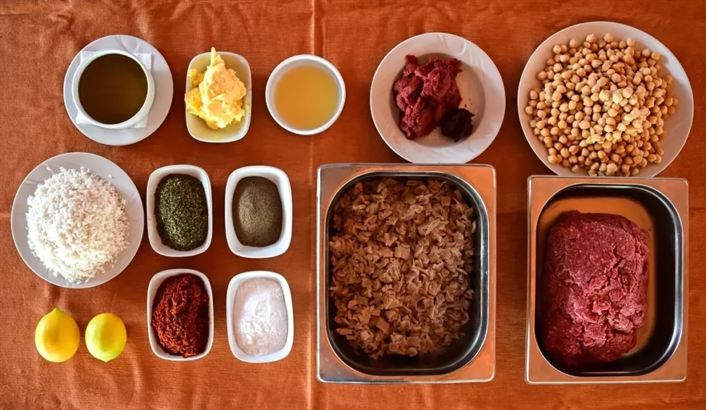 300 граммов говяжьего фарша двойного помола100 граммов нута150 граммов риса1 килограмм говяжьих или бараньих костей3 литра воды2 килограмма курицы или рубца4 луковицы1 лимон4 лавровых листа2 помидора60 граммов сливочного масла60 граммов оливкового масла100 граммов томатной пасты50 граммов перцовой пастыСоль, черный перец горошком, мятаПриготовление