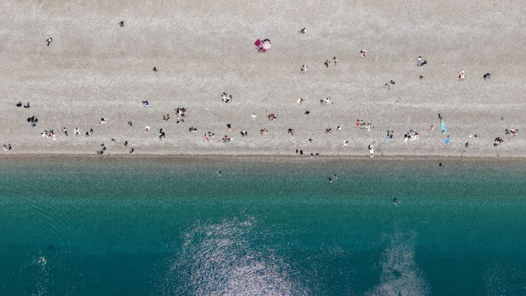 Когда входили на пляж Коньяалты со стороны варианта, молодые люди, поднявшиеся на 6-метровую скалу под обрывами, без страха прыгали в воду. Плотность на пляже и береговой линии также была заснята дроном.